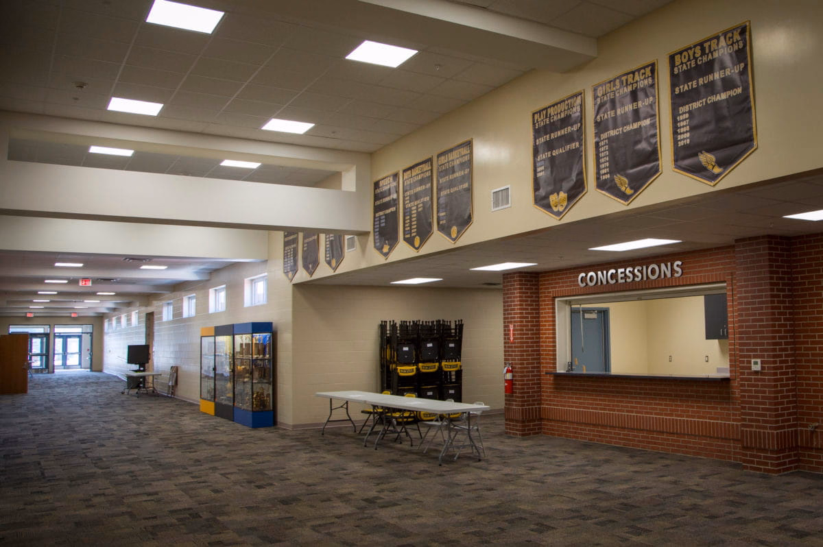 This school renovation and addition encompassed a classroom wing; new gymnasium, locker rooms and fitness center; commons area; kitchen addition and renovation; building security upgrades; and cosmetic, HVAC and electrical improvements to existing spaces. Shelby was able to add a science room and more exterior paving as a result of cost savings BD identified. Since the renovation and addition spanned a school year, BD Construction worked with school leaders to modify and adapt rooms for use as each area was completed so that other areas could be renovated for their final purpose.