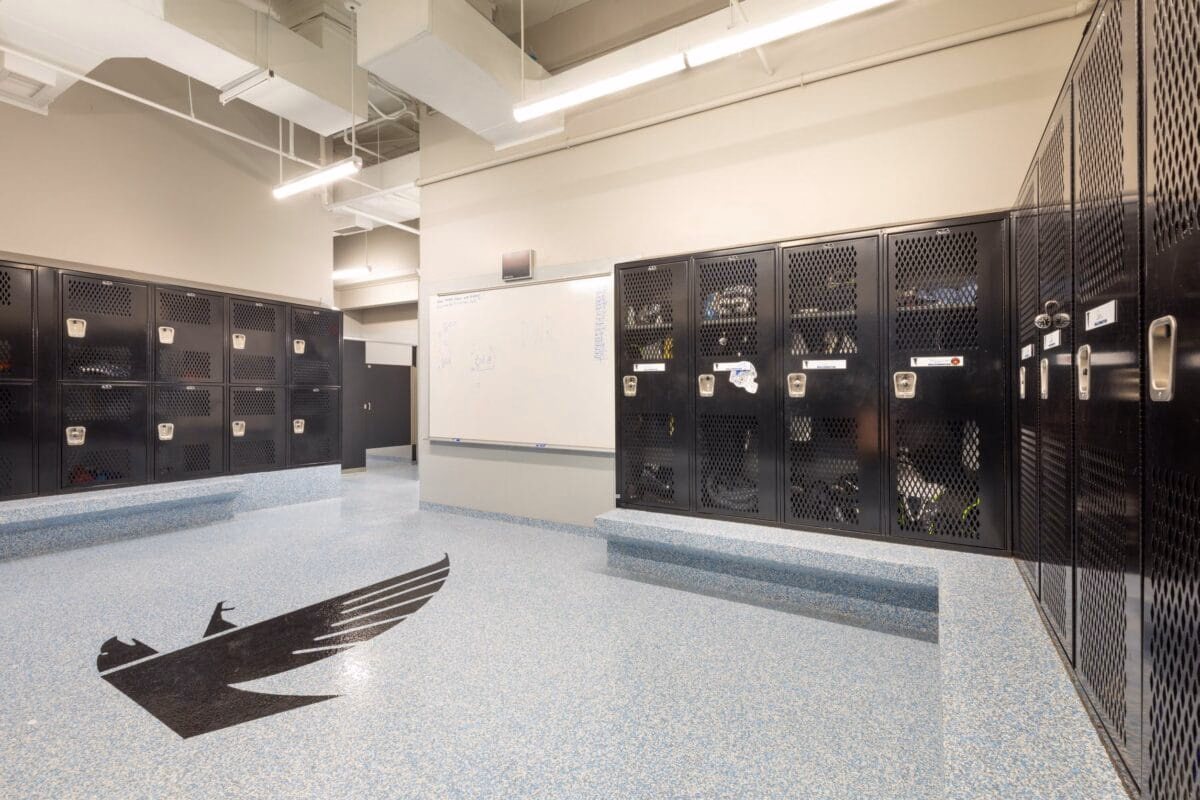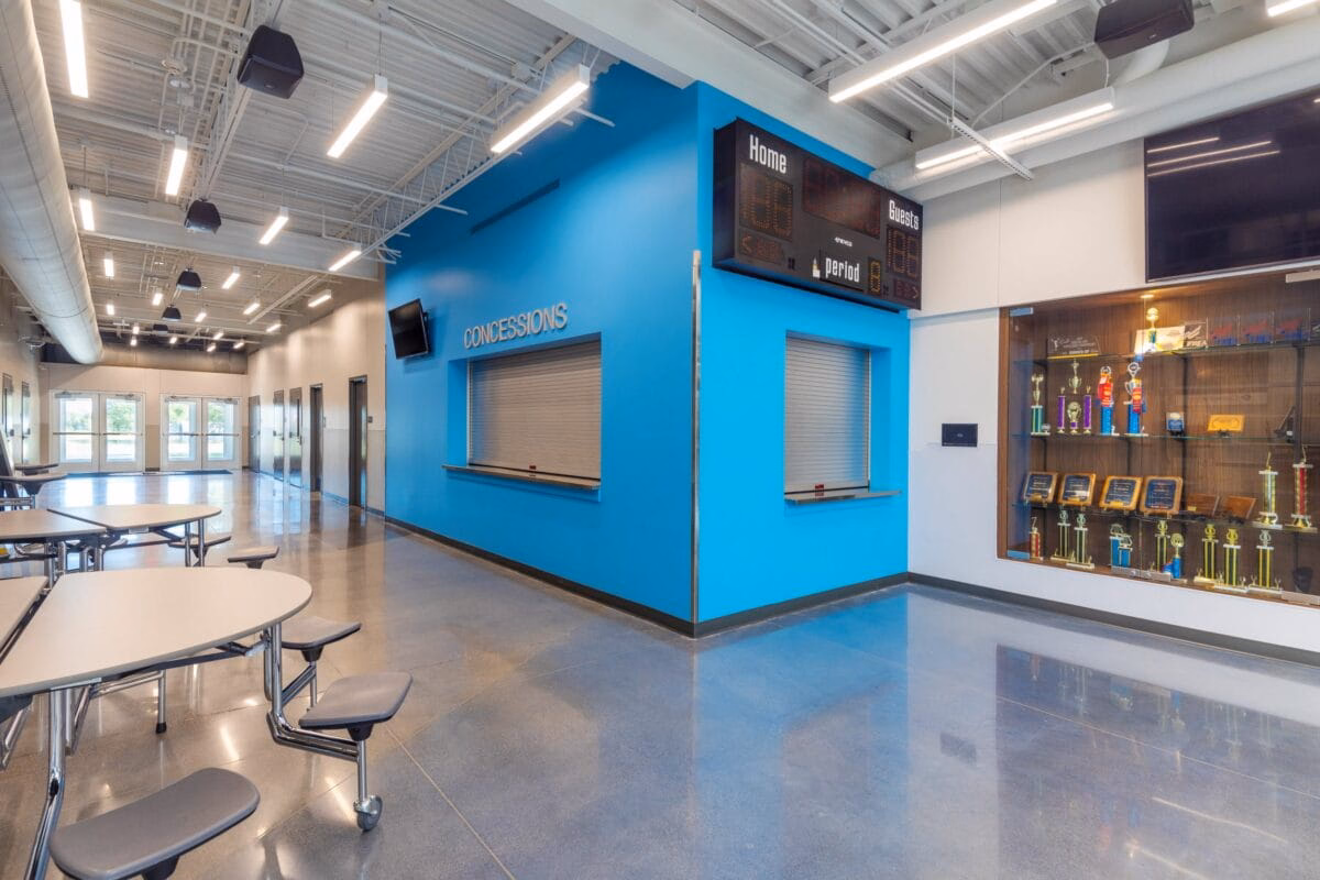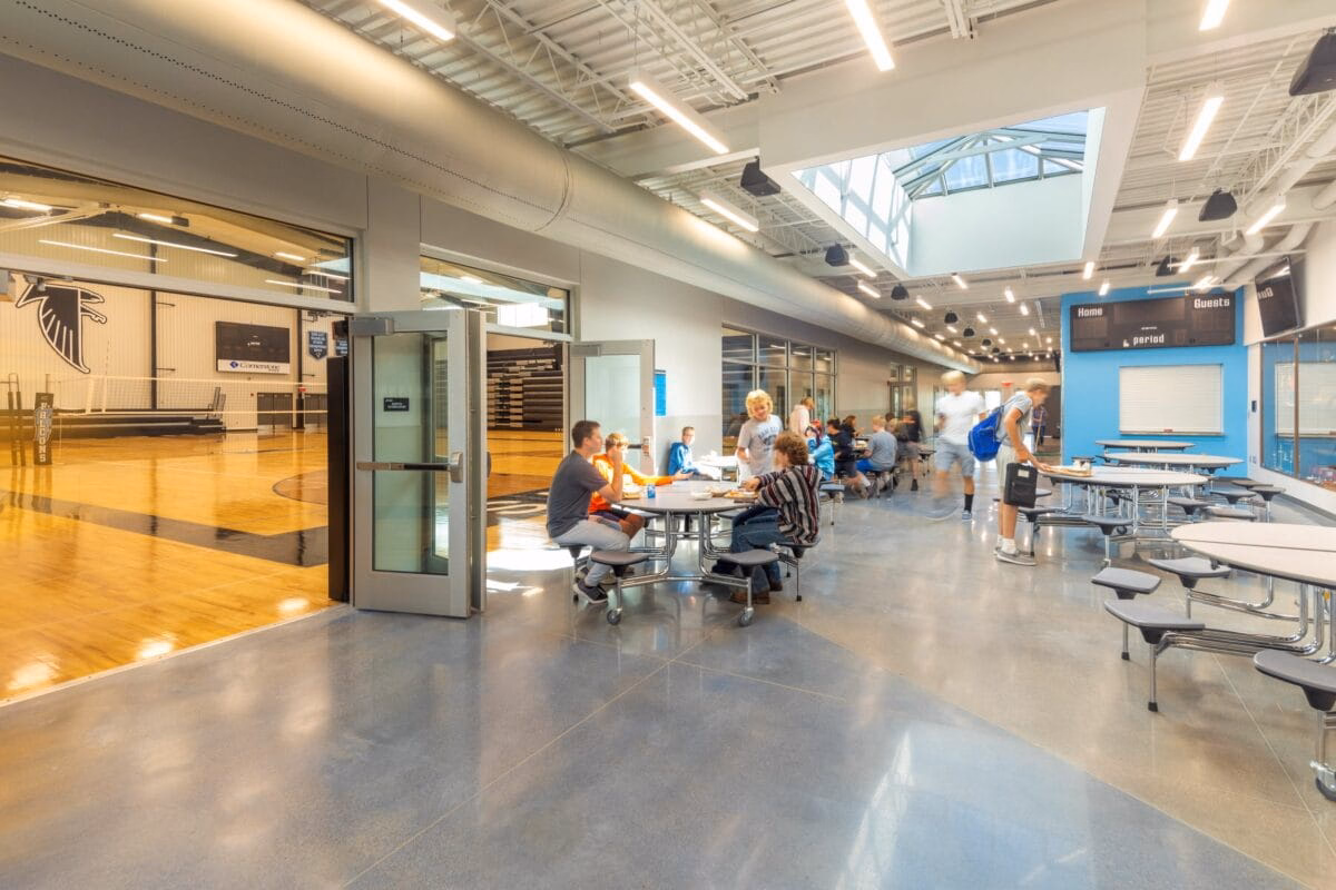 The additions to and renovations of this school included a new main academic entrance with secure vestibule, new administrative offices, staff workroom, secure reception area, and classrooms. Construction of an addition to the north created a new competition gym, locker rooms, new commons/cafeteria and a new kitchen.